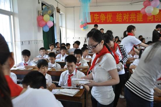 共青團員向少先隊員贈送筆記本與筆